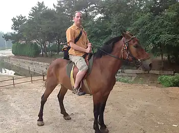 當我們接近主建築群時,有一個人走上前來,説明他提供騎馬服務,我們欣然接受。那是艾斯惟第一次騎馬,僅管他在德克蕯斯州長大,卻對牛仔生涯毫無興趣。我們的馬在去湖邊的路上表現得非常好。那次骑馬之旅,將我們在中國度過最愉快的日子之一,畫上了完美的句號。